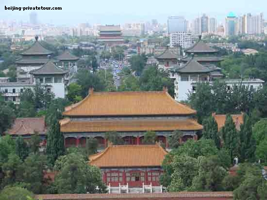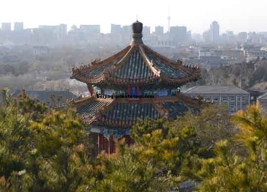 The best view of Beijing is from the Pavilion of Everlasting Spring (Wanchun-ting) perched on top of the middle peak, which used to be the highest point in the city. Northwards, one can see the Drum and Bell Towers, a traditional feature of old Chinese cities. To the south, the golden roofs of the Imperial Palace can be seen stretching into the distance.
